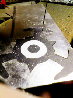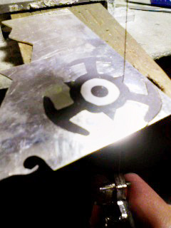 フォトショップでえっちらおっちら描いたものをプリントアウトし、銀の板にノリで貼り付けます。
