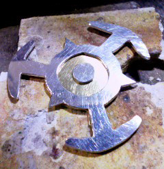 切り抜いたものの下に補強と真ん中の点を留めるための真鍮板をロウ付け(溶接のようなものです)をします。